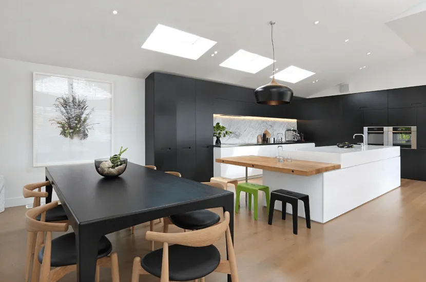 Самое классическое сочетание. Любой тон белого способен нейтрализовать резкий чёрный дизайн, освежив интерьер кухни. Белый привносит ощущение лёгкости, простора и воздушности.