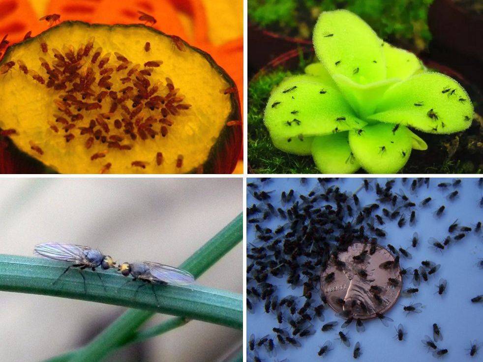 дрозофила, насекомое, которое внешне напоминает обычную муху только небольших размеров, питается данная разновидность соками растений, микроорганизмами, а также гниющими остатками, встречается в циперусах, каллах, фиалках, орхидеях, но могут завестись и в других растениях;