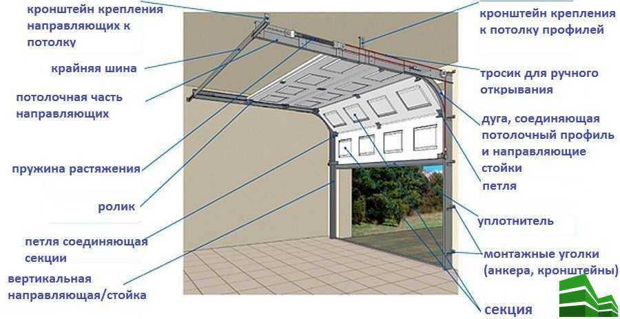 В верхних торцах можно обнаружить две направляющие, по которым происходит движение роликов. Благодаря этим элементам обеспечивается подъем створки вверх. Для того чтобы ворота начали подниматься, необходимо только потянуть за ручку. Каких-либо усилий для их открывания прилагать не приходится, поскольку имеются пружины, находящиеся в растянутом состоянии.