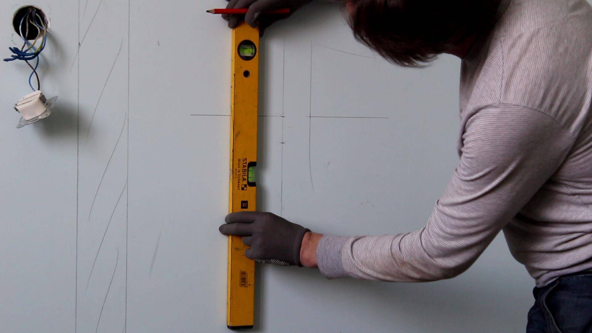 Далее полотно выравнивают по отвесу, лазеру либо начерченному ориентиру на стене и прижимают сверху