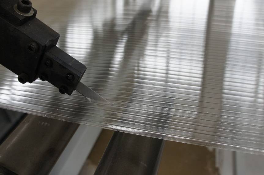 Монтаж листов отличается в зависимости от типа материала. Сотовый поликарбонат с успехом используется для изготовления скатных конструкций с углом ската не менее 11%. Сотовый материал хорош тем, что его можно разрезать без особого труда. При толщине от 4 до 10 мм он отлично режется ножом. Более толстый материал можно разрезать при помощи пилы или электрического лобзика.