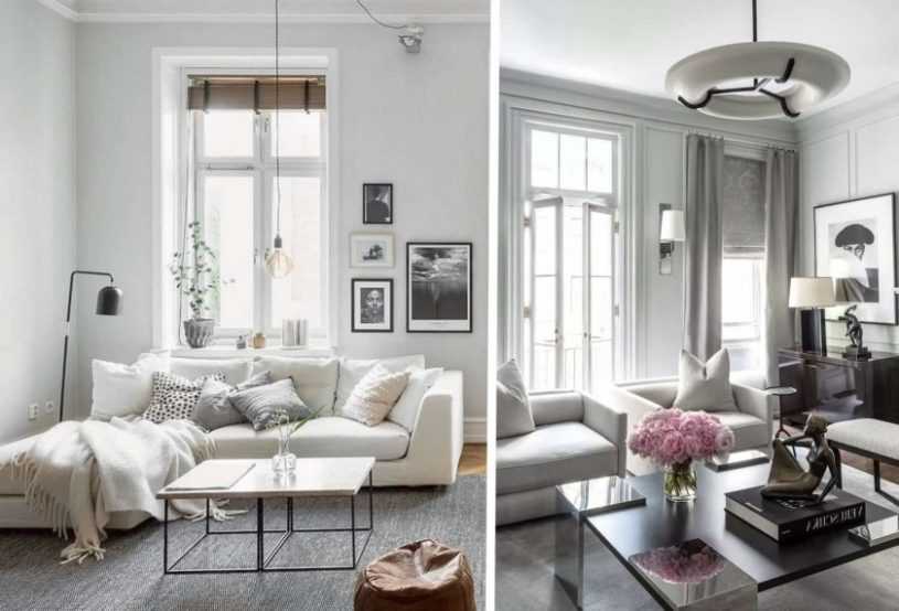 В гостиных, выходящих на северную сторону, лучше использовать теплые оттенки, а южное направление не пострадает и от холодных тонов.