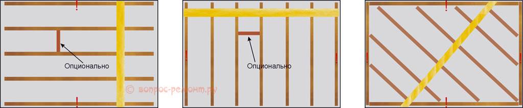 Схемы обрешеток под вертикальную, горизонтальную и по диагонали обшивку даны на рис. Общий принцип – брусья обрешетки перпендикулярны доскам. Не нужно пренебрегать краевыми брусьями (отмечены красными !): висячих кончиков досок не должно быть; каркасная рама под по диагонали обшивку обязана иметь непрерывное обрамление. Толщина брусьев обрешетки – 20-40 мм; ширина 30-60 мм. Шаг установки брусьев – 4-5 ширин доски по верхней пласти.