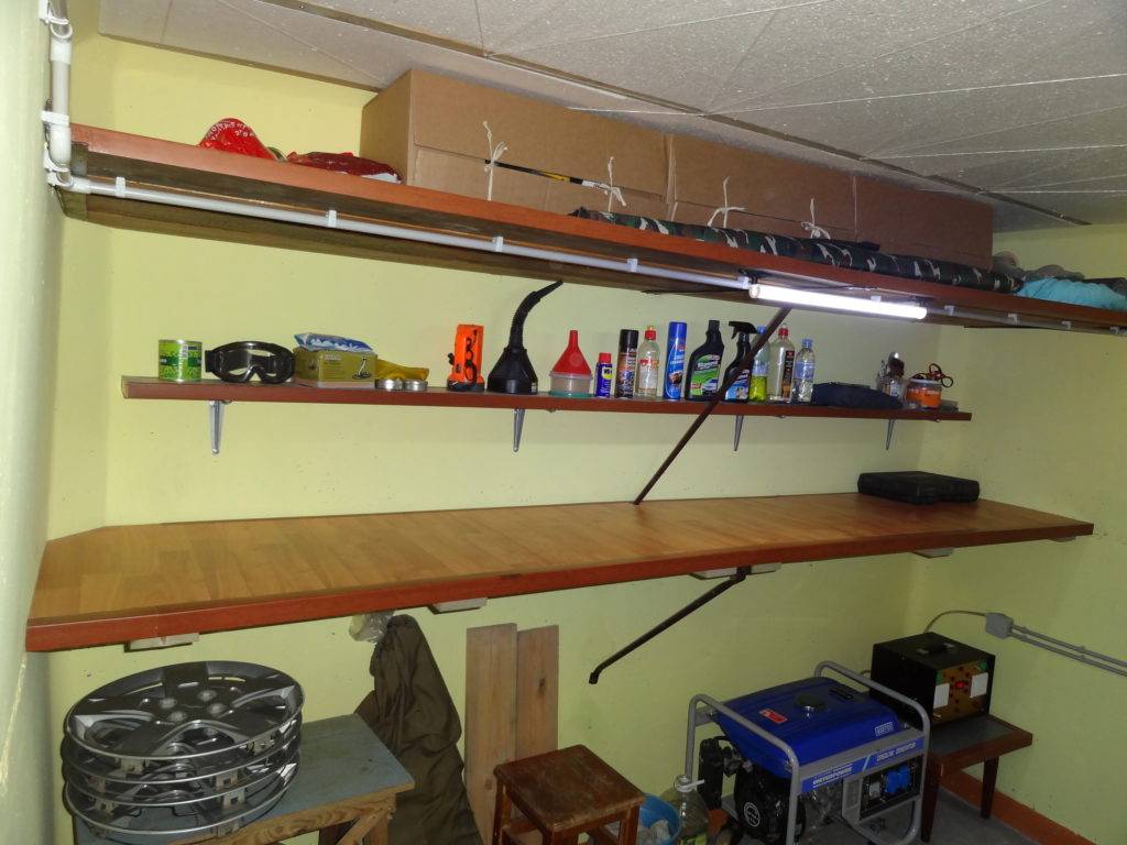 Вариантов размещения в гараже столько, сколько хозяев у этих гаражей. Ниже приводятся примеры удачных решений. Полезную площадь займёт рабочий стол, без него обойтись нельзя. Его удобно разместить у дальней торцевой стенки. Для него в глубину потребуется примерно 0,6 м, по ширине ─ минимально 1,0 м. Чтобы сесть человеку перед столом надо ещё 0,6 м. По обе стороны от рабочего стола можно размещать полки, стеллажи и т. п. а можно и увеличить ширину рабочей части стола во всю ширину торцевой стены. Там ведь надо размещать тиски, наждак, сверлильный станок.