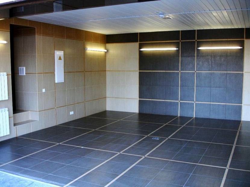 Пол гаража можно выложить специальной технической керамикой с повышенной прочностью и антискользящей поверхностью. Этот вариант достаточно практичен. При этом он обеспечивает привлекательный дизайн помещению, так как существует в различных цветовых вариантах. Но керамическое покрытие может растрескиваться и раскалываться, а швы между плитками впитывает горюче-смазочные материалы.