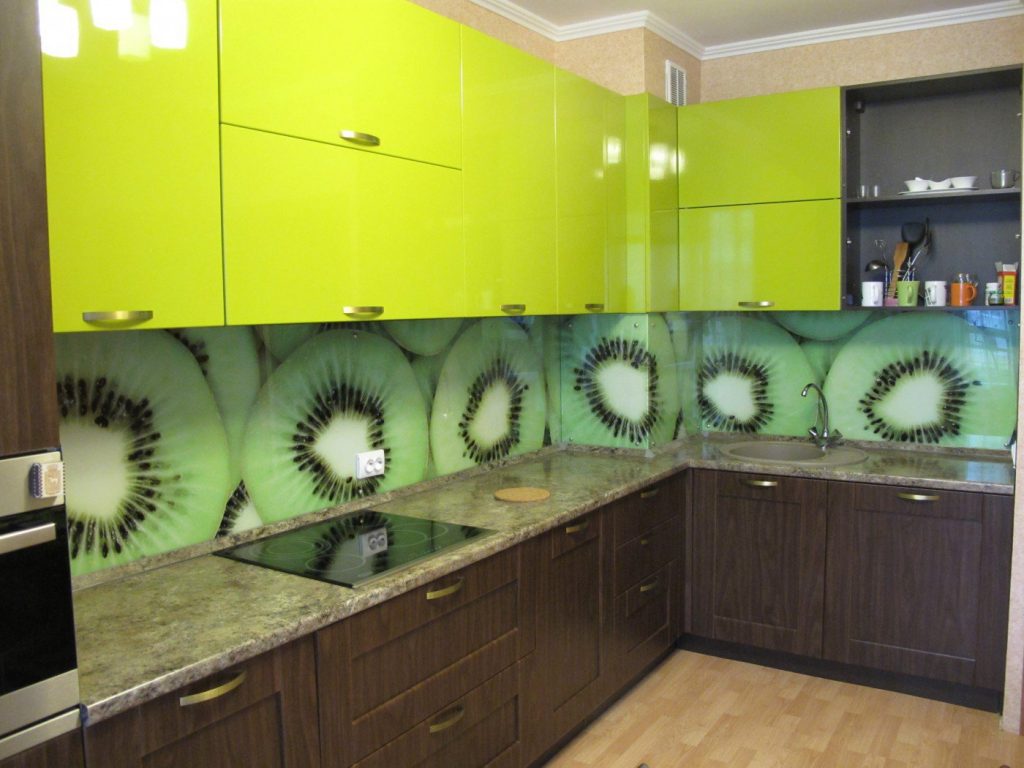 Стеклянный фартук с фотопечатью позволяет создать любой рисунок по желанию своего будущего обладателя. Прозрачная поверхность прекрасно покажет отделку этой зоны, сделав фартук практически незаметной поверхностью.