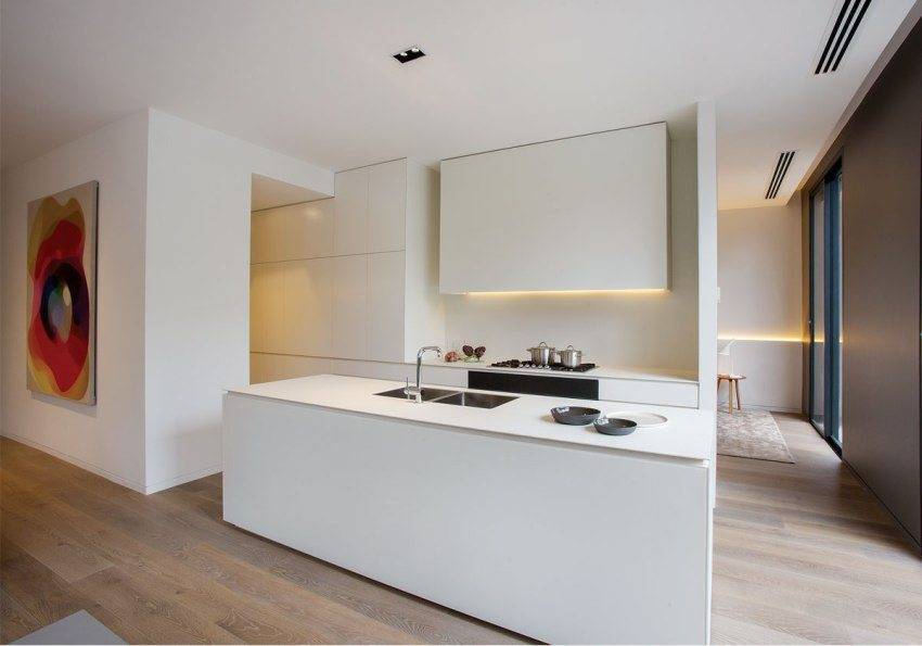 С другой стороны, подсветку вы можете установить и другим способом, например, просто приклеив светодиодную ленту или установив споты под шкафы как показано на фото ниже.