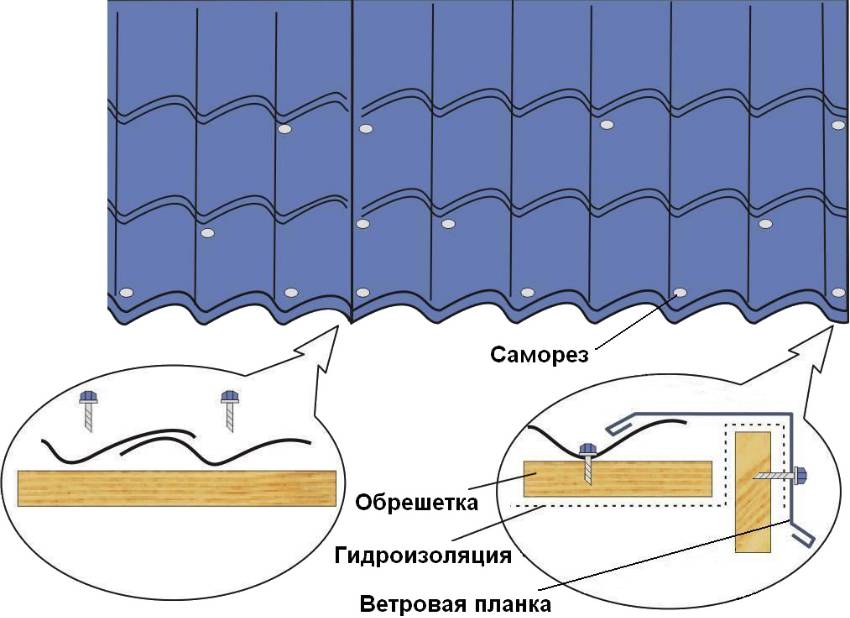- торцевые планки должны быть зафиксированы внахлест, который должен составлять порядка 2 см. При этом размер волны должен быть подогнан в соответствии с шириной ската. В противном случае можно столкнуться с тем, что гребень уложится на фронтон;