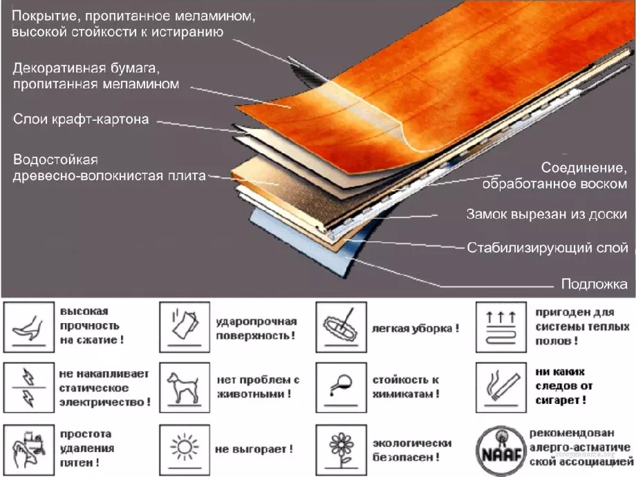 На верхнем слое может располагаться рельефная текстура. Кроме декоративной, он выполняет функцию внешней защиты ламината от истирания и действия влаги. Каждый край основания оборудован специальными замками, с помощью которых панели соединяются между собой. Данный элемент считается наиболее слабым звеном, поэтому, решая задачу, как уложить материал, с выступами замков следует обращаться очень аккуратно. Нанесение сильных прямых ударов нередко приводит к их разрушению.