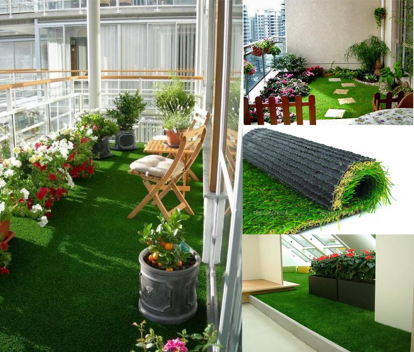 Очень эффектно выглядит на балконе ковролин, имитирующий зеленую лужайку