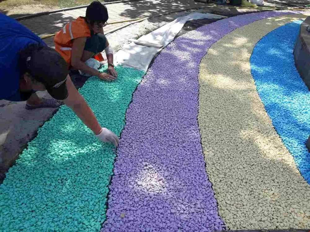 Если в вашем доступе нет бетономешалки, тогда создать окрашенный щебень будет сложнее, но возможно – вам придется камень засыпать в емкость с краской и самостоятельно перемешивать, а после просушивать щебень.