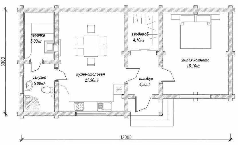 Несмотря на столь малые габариты, баня 3х4 м вполне подойдет для семейного пользования. Кроме того, постройка предполагает несколько вариантов размещения комнат внутри. Некоторые планировки также подразумевают вход в комнату отдыха прямо с улицы. Отгораживать небольшое помещение бессмысленно, а потому защитой комнаты отдыха от холодного воздуха послужит пристроенный тамбур.
