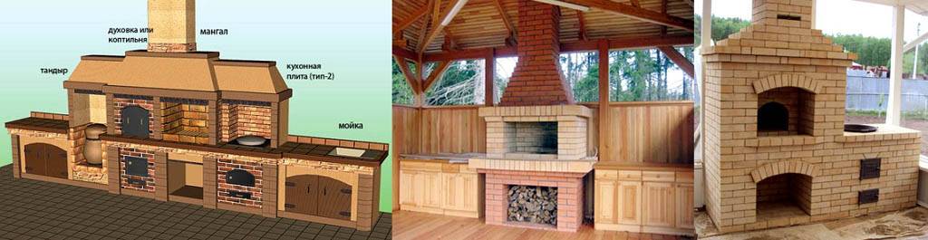 Полный летний кулинарный печной комплекс для беседки, сада, дачи (слева на рис. ниже) не просто громоздок, сложен и дорог. Строить его для индивидуального пользования имеет смысл только на приусадебном участке, когда семья в теплое время буквально живет в беседке.