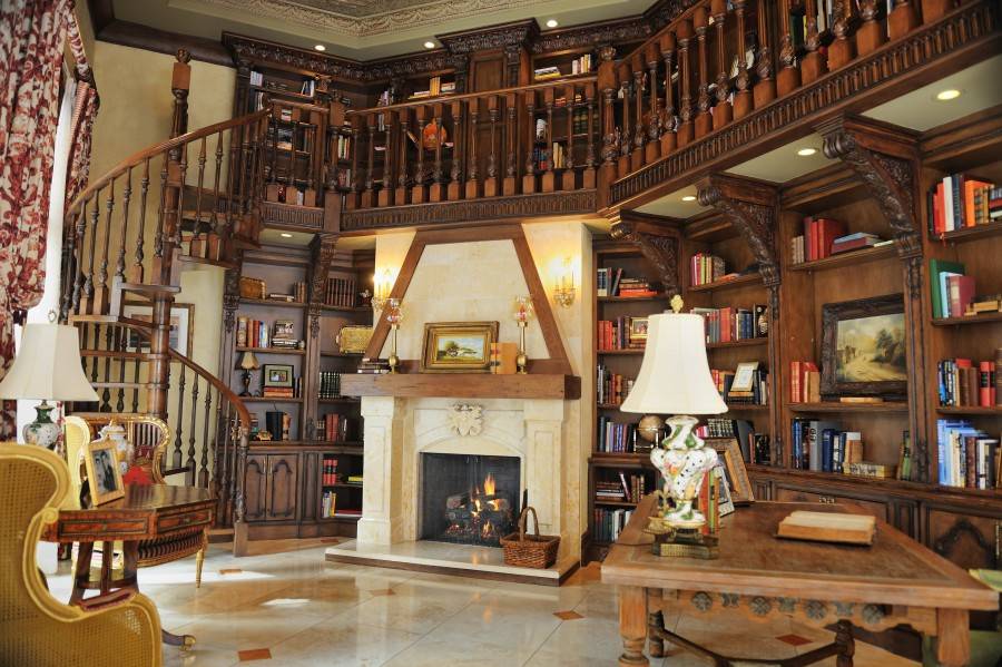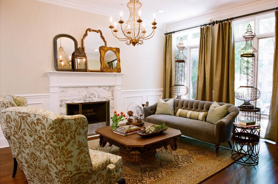 Облицовывать камин можно различными материалами в виде мрамора, древесины или известковых панелей. На полочке над камином принято выставлять часы, скульптуры из бронзы, вазоны с цветочками и табакерки с портсигарами.