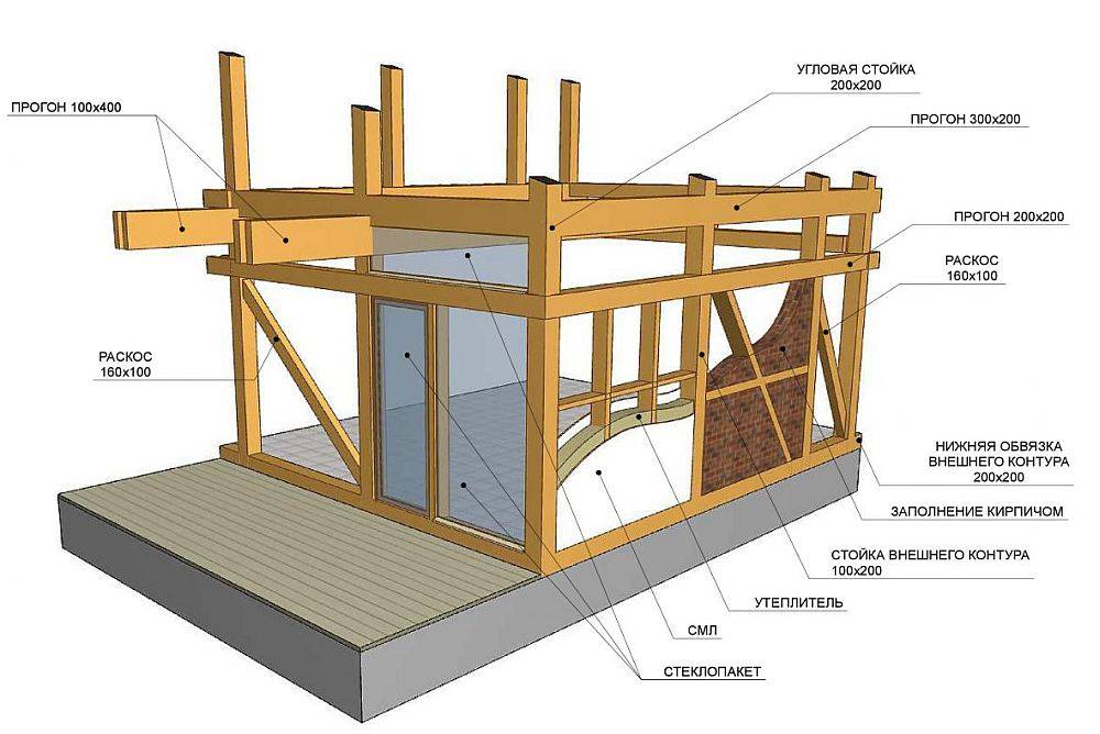 При создании каркаса используется брус, сечение которого 5х5 см. Обязательно проведите обработку антисептиком перед монтажом для создания защиты от процессов гниения. Если планируете нанести несколько слоев, то делайте перерывы, чтобы средство успело полностью высохнуть.