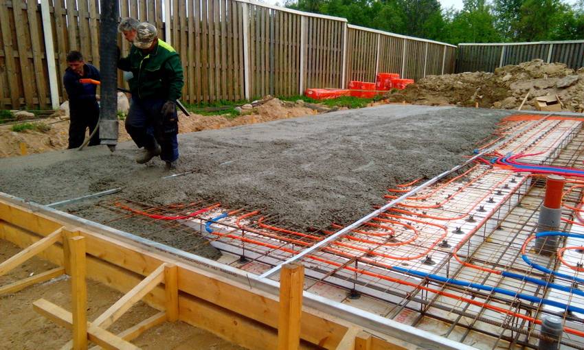 Про заливку бетонной стяжки мы рассказывать не будем. Скажем лишь, что опалубка для плиты не нужна, так как ею является ленточный фундамент по периметру здания. Имеет смысл добавлять в бетон пенетрирующие добавки для надежной гидроизоляции конструкции. Также с помощью битумной мастики и оклеечной гидроизоляции производится гидроизоляция фундамента своими руками по внешнему периметру.