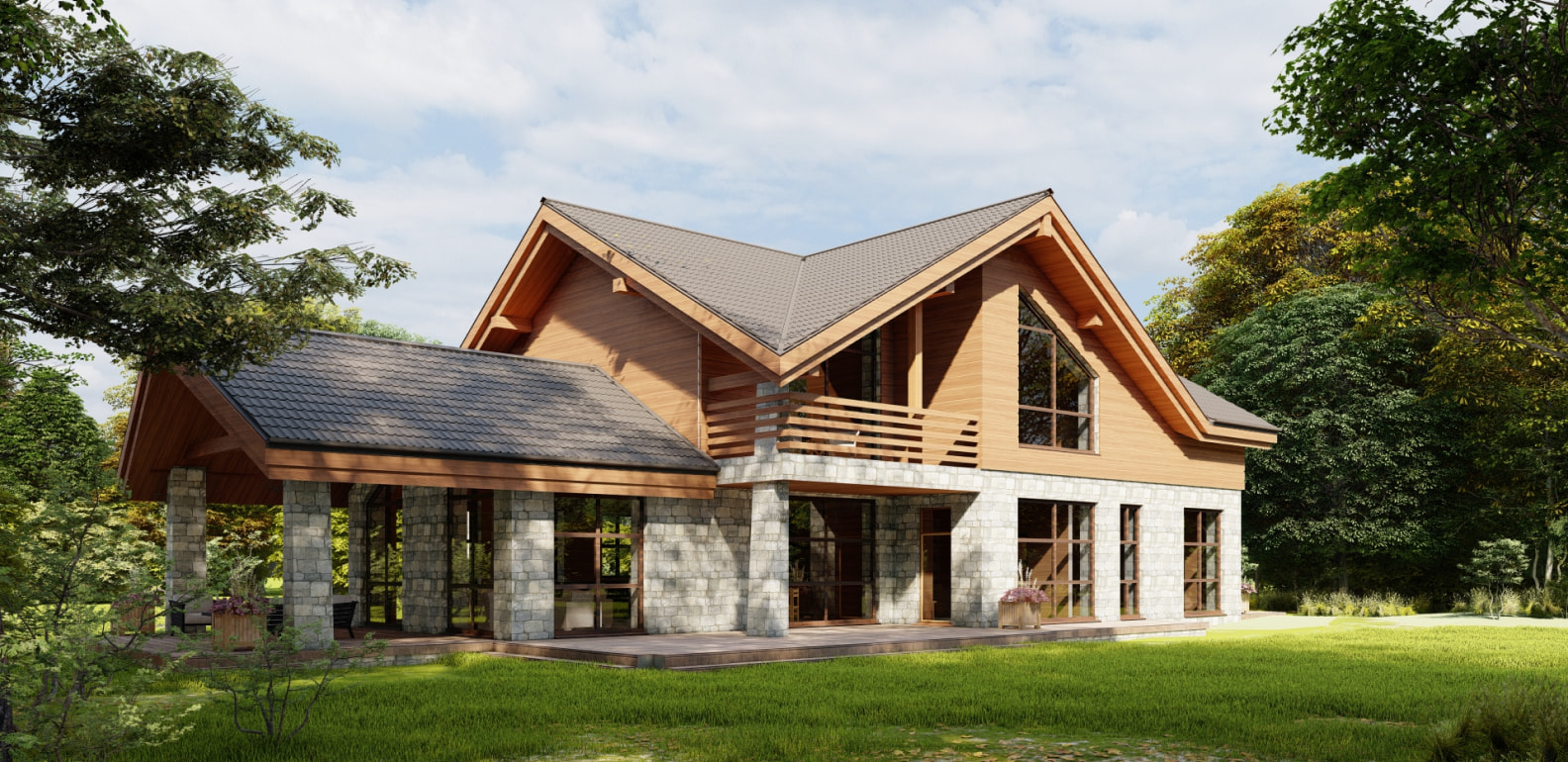 При возведении дома применяют древесину и камень. Строение в стиле шале можно узнать по двускатной крыше с выступающими за пределы дома краями.