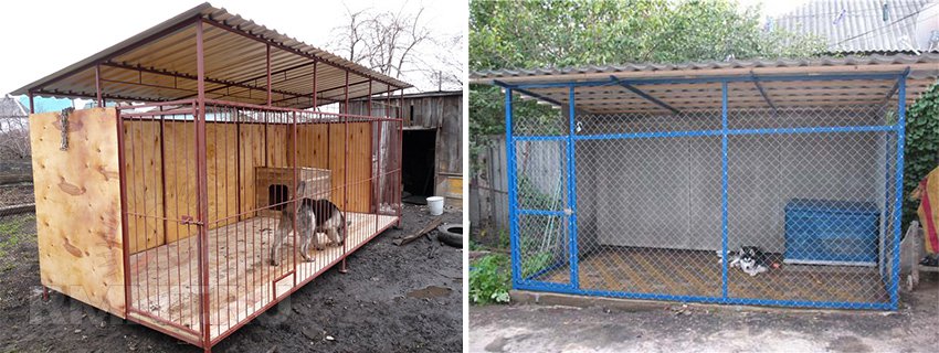 Дверь делается из уголков, которые свариваются в виде четырёхугольника, она обшивается фанерой, жестью, металлическим листом или досками. Каждая порода собак имеет свой темперамент, например, для флегматичных крупных мастиффов достаточно будет пространства 12–14 метров. Для более подвижных и энергичных (хаски или немецкая овчарка) потребуется не менее 17 квадратных метров.