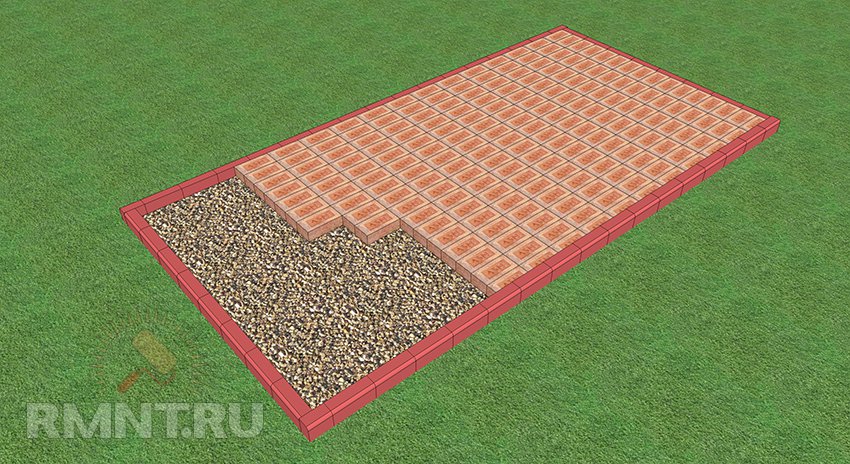 На размеченном участке нужно снять грунт на штык лопаты, образованное пространство засыпать равными слоями мелкого щебня и песка. Высота подсыпки должна быть такой, чтобы после укладки используемого материала площадка возвышалась над прилегающим грунтом около 30–50 мм. Поверхность должна быть плотно утрамбована и выровнена рейкой, вымащивать площадку нужно без дополнительного уплотнения.