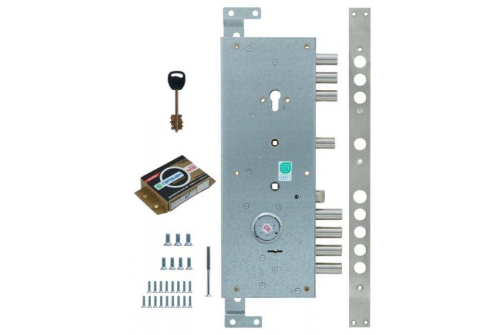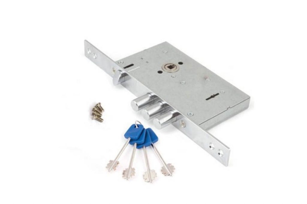 - — рычажными: наиболее надежные и распространенные запорные механизмы; тяжелые, с большей устойчивостью к кражам; позволяют оборудовать взаимодействие с дополнительными дверными механизмами для защиты дверных конструкций.