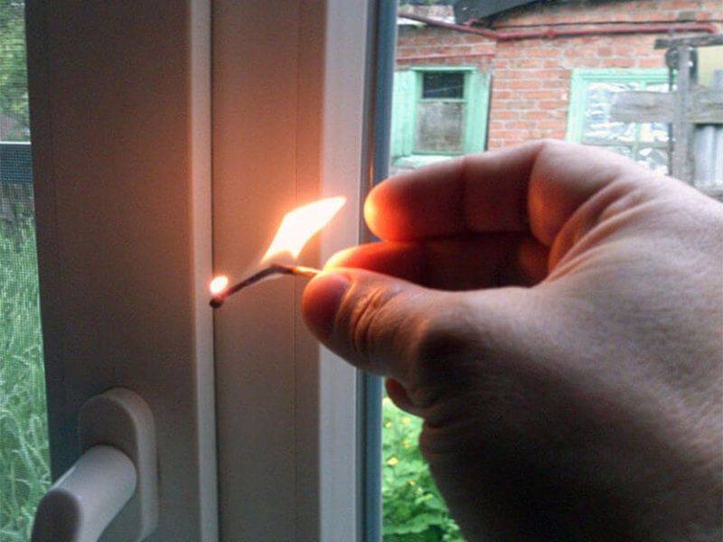 Если визуальным осмотром не удалось выявить причину, можно использовать некоторые хитрости. Например, намочить руку водой и поднести ее к разным частям окна. Еще более чувствительный способ – зажженная свеча или зажигалка. Пламя реагирует на любые колебания воздуха, они и укажут на места потери тепла.