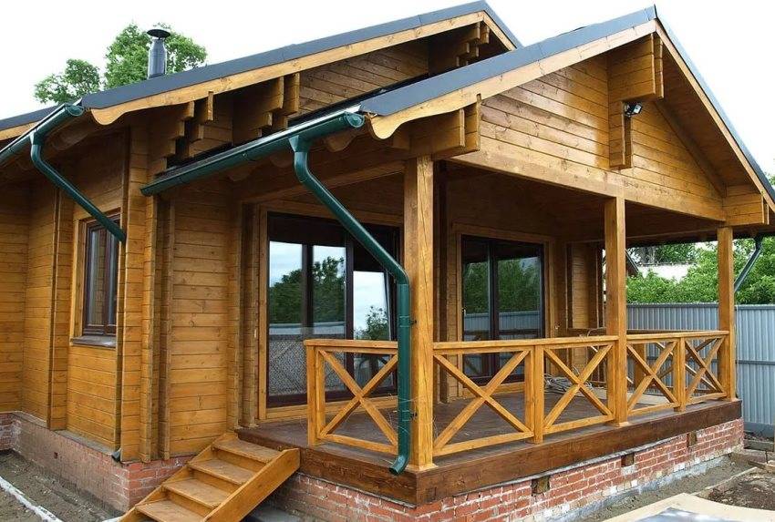 Проекты крытых террас обычно имеют односкатную крышу, опирающуюся по внешнему периметру на столбы. Чаще всего их делают из бруса (обычного или клееного), реже из металлической трубы. Брус крепят к нижней обвязке на цоколе или к ростверку. Трубу бетонируют вместе с монолитным основанием. За редким исключением эти опоры выступают частью ограждения — к ним крепят перила.