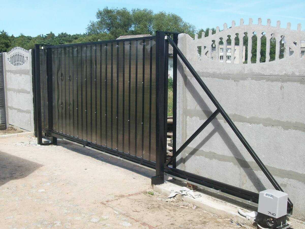 В нижней части расстояние до поверхности грунта должно быть не менее 100 мм. Это нужно для компенсации возможного проседания конструкции. В качестве материала обшивки можно использовать профнастил. Для надежной фиксации профнастила привариваются дополнительные ребра жесткости. Дополнительно можно предусмотреть небольшую калитку. Альтернатива – сделать ее отдельно, если позволяет ширина монтажного проема.