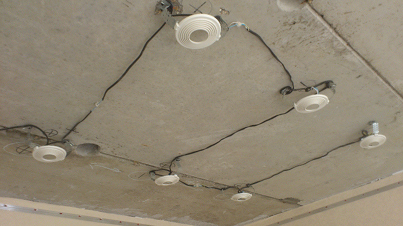 Если потолок помещения представляет собой железобетонную плиту, в которую встроены технологические каналы для прокладки электропроводки, нужно помнить, что в таких каналах имеются грудки бетона, которые могут помешать прокладке кабеля. В таком случае лучше воспользоваться способом наружной протяжки, прямо по поверхности бетонного потолка. Это касается в основном старых домов «советской» постройки. В новостройках же перекрытия устроены по-другому, в них, как правило, заранее проложены электротехнические коммуникации, которыми можно воспользоваться, не тратя лишнее время и материалы.