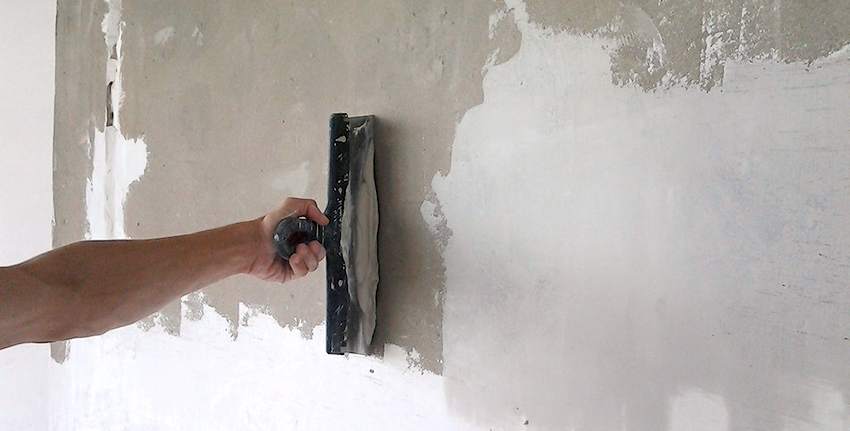- Все неровности на стенах устраняют. Крупные трещины обрабатывают гипсом и несколькими слоями штукатурки. Неглубокие трещины заделывают раствором цемента и гипса, взятых в пропорции 1:3. Затем на данный участок клеят ленту-серпянку и шпаклюют.