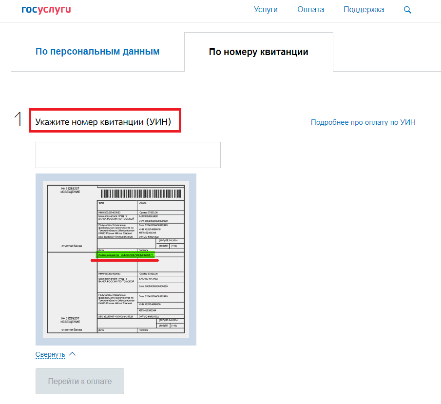 Или можно ввести номер квитанции, если она у вас есть. Введите УИН, указанный на бланке.