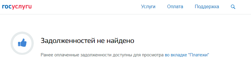 В случае выявлении задолженности, в окне будет указана сумма долга по налогам, пеням и штрафам. И вы можете сразу перейти на оплату задолженности.