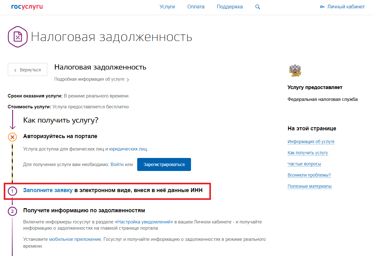 Чтобы воспользоваться услугой «Налоговая задолженность» на сайте Госуслуги, вам необходимо войти в Личный кабинет или зарегистрироваться.