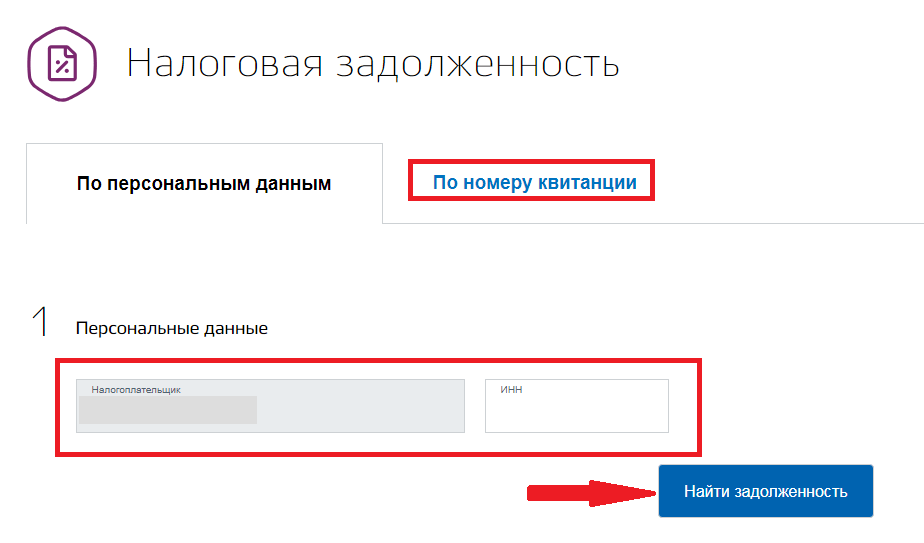 Заполните фамилию имя отчество и ИНН. Затем нажмите «Найти задолженность».