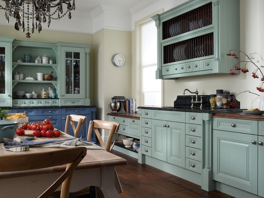 Прованс. Именно этот стиль невозможно представить без светлой мебели. Применяется фрагментарное декорирование кракелюром (искусственным состариванием), дверцы стеклянные с деревянными переплетами.