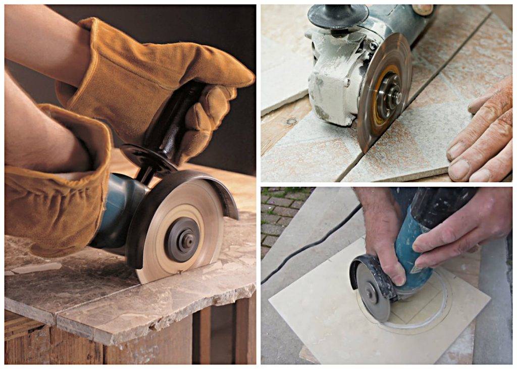 с использованием болгарки и отрезных кругов для работы по камню. К достоинствам можно отнести высокую производительность, но резка сопровождается сильным запылением помещения, края плитки получаются неаккуратными, крошатся. Рекомендовать можно для работы на открытом воздухе при большом фронте работ;