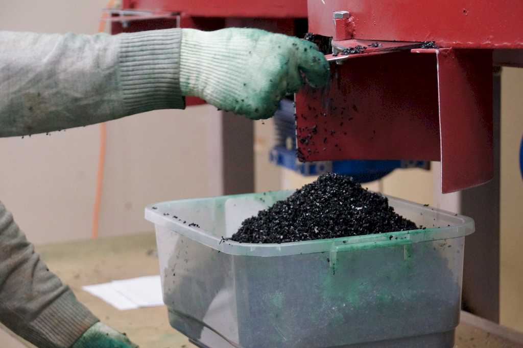 - Получение крошки на промышленном оборудовании полного цикла с удалением корда и последующим измельчением резины.