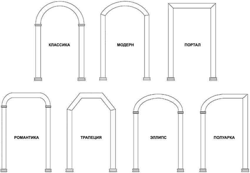 Форм для изготовления арок не так уж и много, но все они так или иначе применяются хозяевами квартир в процессе проведения ремонтных работ. Самые распространённые разновидности арок: