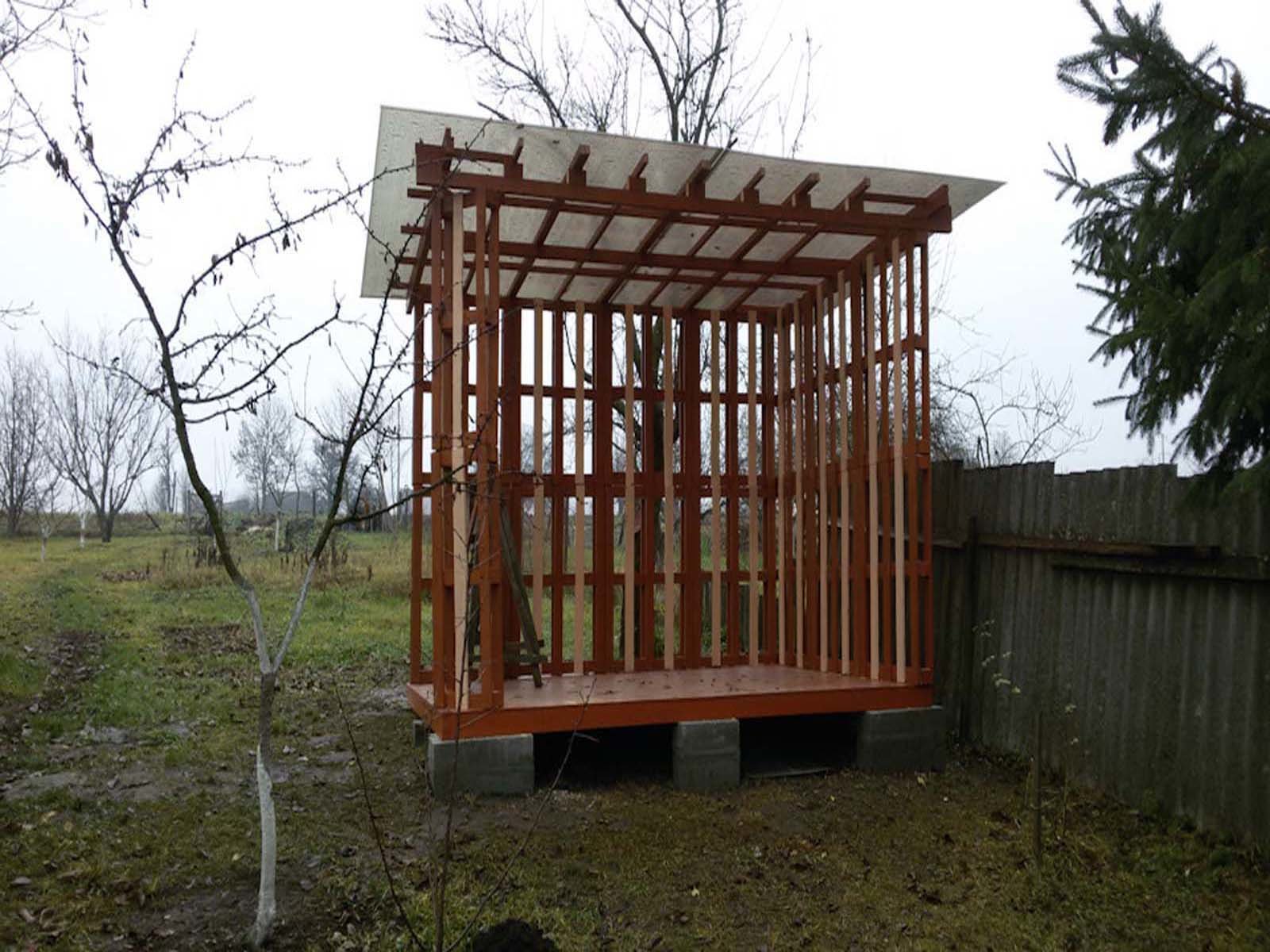 - Фиксируют конструкцию для крыши: ее вид зависит от выбранной модели. Это, как правило, обычная односкатная крыши. В этом случае опорные столбы имеют разную высоту.