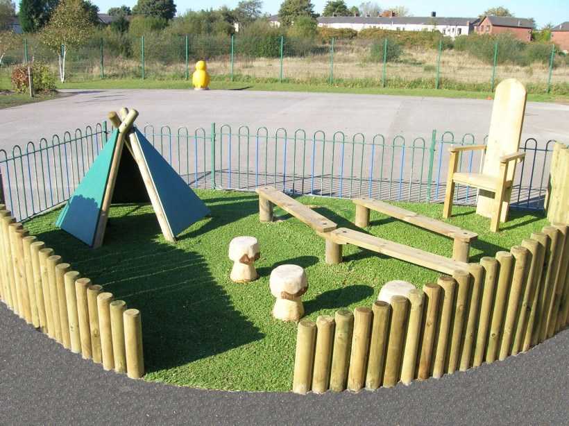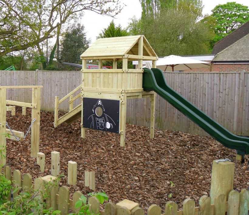 При возведении сооружений на площадке нет необходимости придерживаться единого стиля с дачным строением. Наоборот, она должна быть яркой, красочной, похожей на сказку. Стоит также посоветоваться с будущими хозяевами.