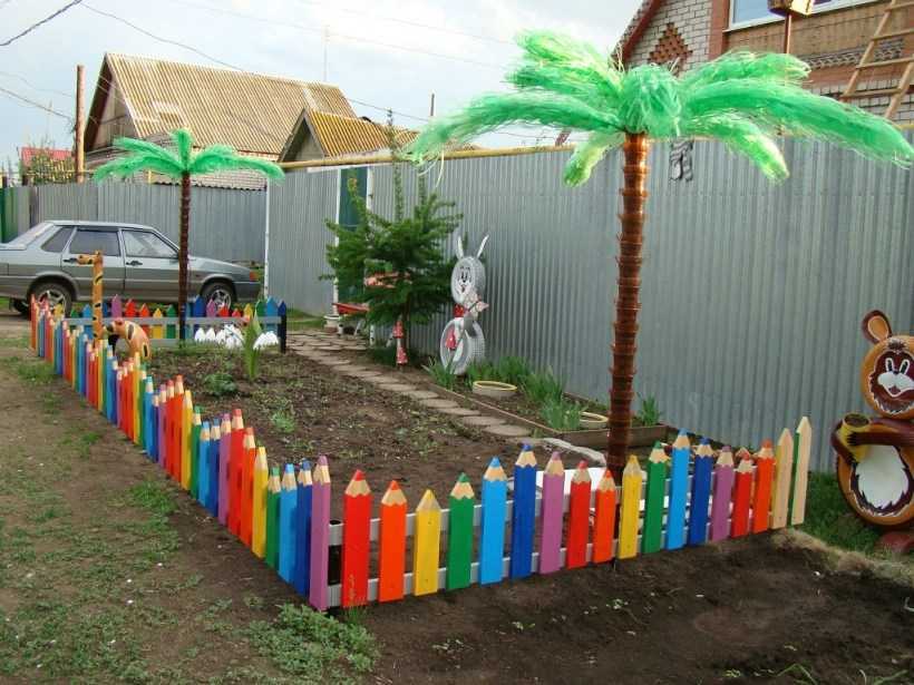Конечно, ограждать детскую площадку необязательно, но небольшой заборчик сделает ее только красивее. Сделать забор можно из подручных средств. Даже обычные пластиковые бутылки могут украсить пространство. Из них можно сделать красивых зверушек или покрасить в разные цвета.