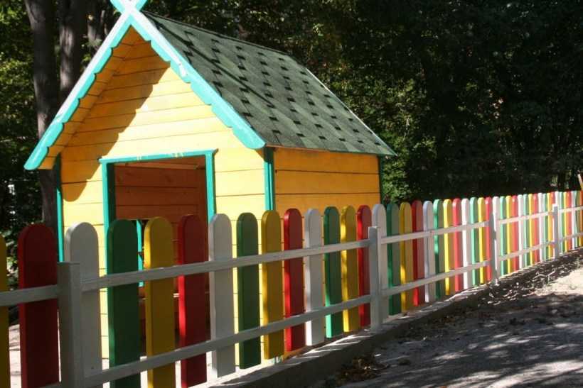 Необычно будет смотреться деревянный забор. Каждый брусок или бревно покрасьте в яркий цвет. Сделайте красивую дверку. Ребенку доверьте создание рисунков, которые будут украшать весь ваш участок. Как сделать детскую площадку своими руками?