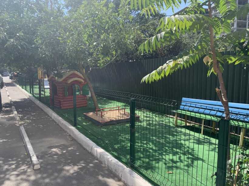 • Площадка для самых маленьких. Представляет собой обширное пространство для песочницы, по бортикам которой располагаются лавочки. Один из углов занят игровым домиком, в котором можно прятаться или укрываться от солнца.