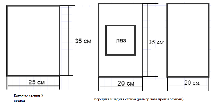 Сколько бы ни говорили об устройстве домика для кошки, лучше всего понять габариты позволяют чертежи с размерами. Если вы внимательно на них посмотрите, заметите солидный разбег. Это понятно — кошки есть крупные и мелкие, соответственно и размеры кошачьего домика будут больше/меньше. Вы их сами можете корректировать в зависимости от размеров ваших питомцев или имеющейся в распоряжении площади.