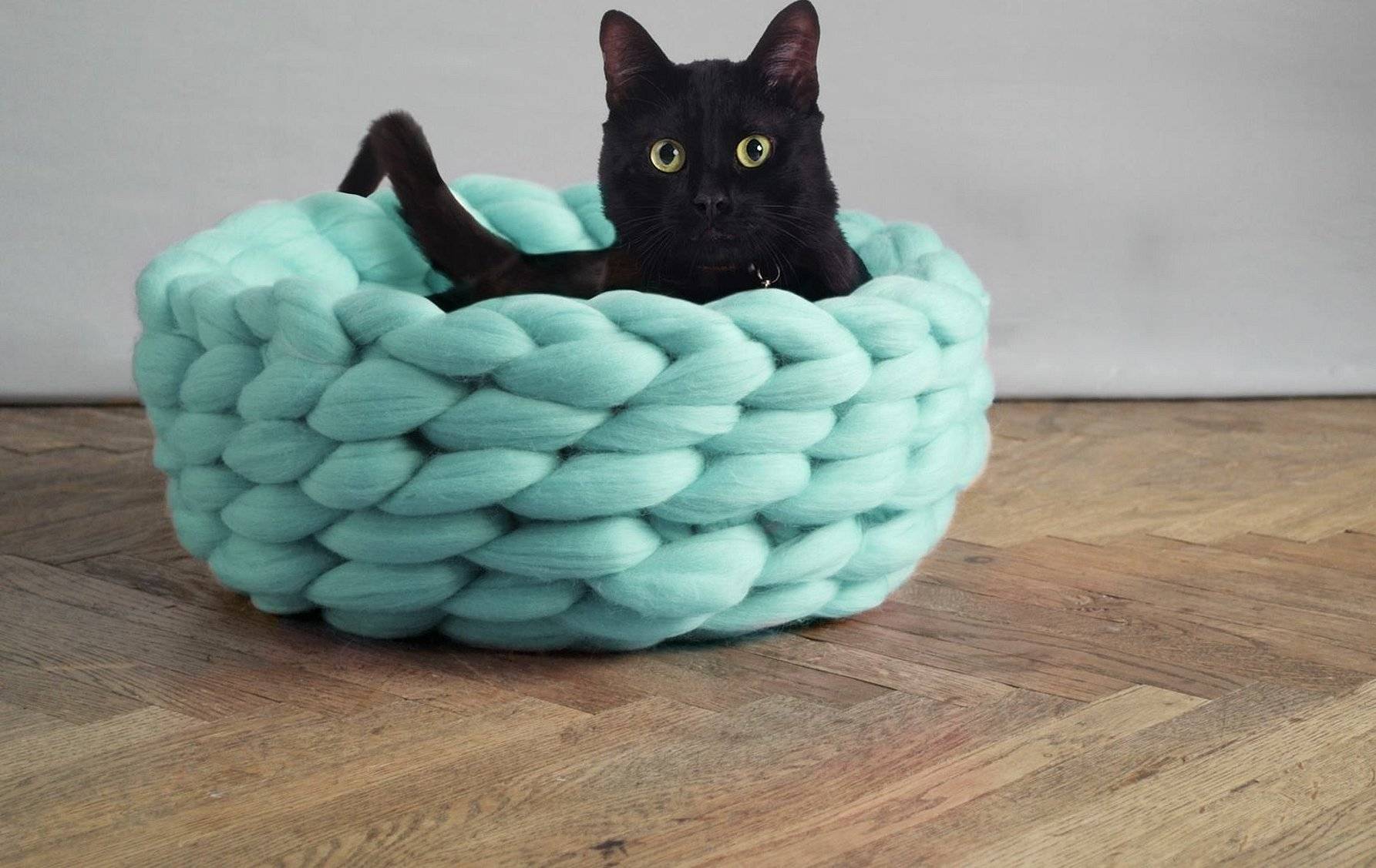 Вязаная кровать для кошки. Для ее изготовления потребуется умение вязать и специальная толстая пряжа. На дно можно положить круглую мягкую подушку.