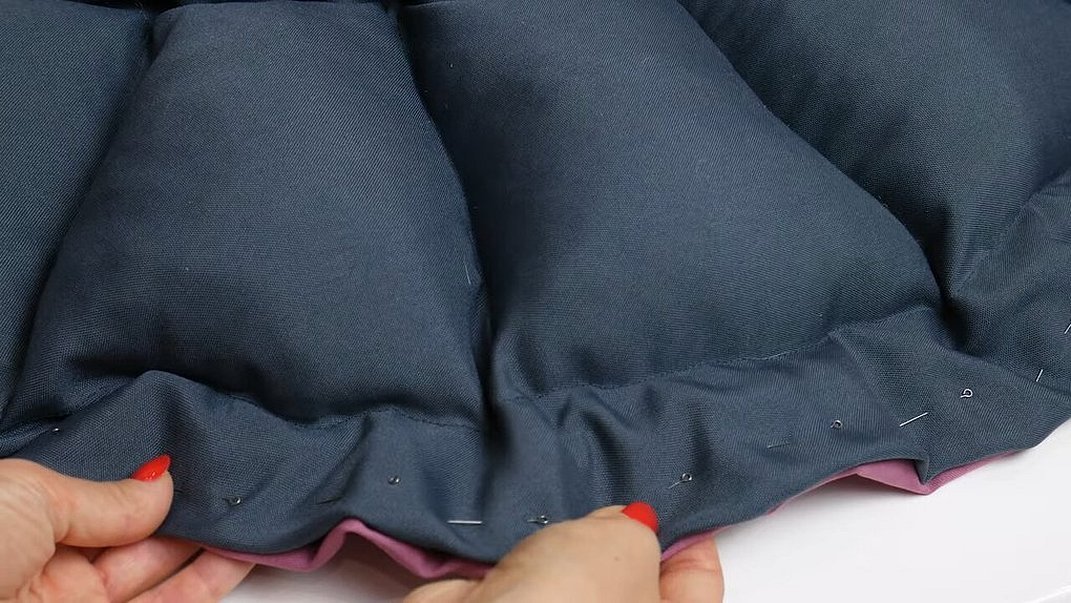 - По намеченным линиям проложить машинные строчки. Для наполнения середины лежака не зашивать одну из секций.