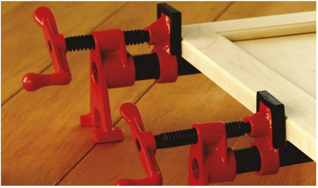 - Каждый древесный элемент имеет заводской шип с пазом. Они промазываются клеевой основой. Доски соединяются друг с другом. Полученную конструкцию необходимо сдавить струбциной;