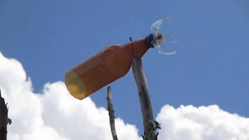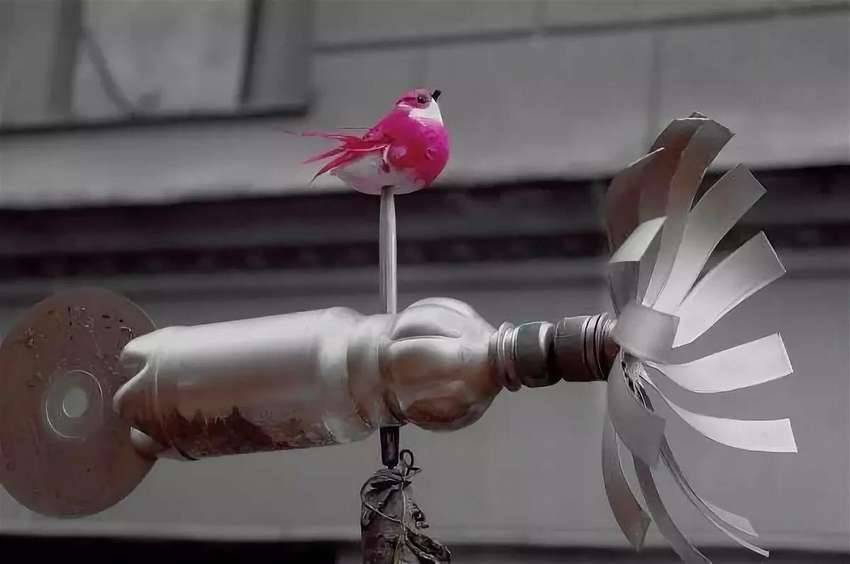 Бутылки можно покрасить из баллончика и прикрепить к флюгеру маленькую птичку.