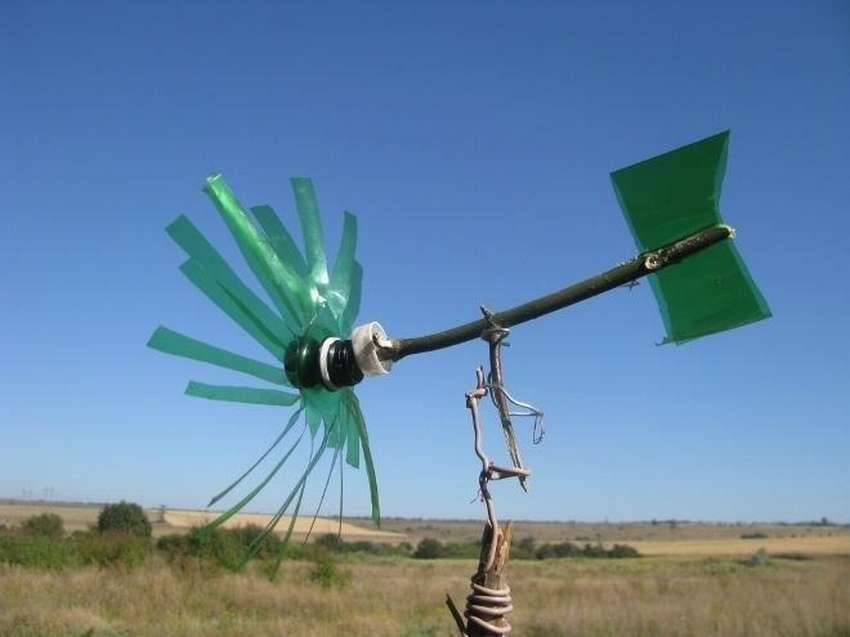 - Подсобные предметы. В любом доме всегда найдется множество материалов, которые по своей сути являются расходными и ничего не стоят. К таковым относятся пластиковые бутылки, диски, контейнеры. Полимерные изделия легкие, гибкие, детали можно склеивать, сшивать, скреплять заклепками и болтами. Поскольку достаточной прочностью такие изделия не отличаются, ставить их на крышу нецелесообразно. Лучше в качестве подставки использовать деревянные жерди или стальные опоры из труб. На несколько дней работы их хватит, а потом ветряк можно снять и поставить на его место новый, тоже одноразовый.