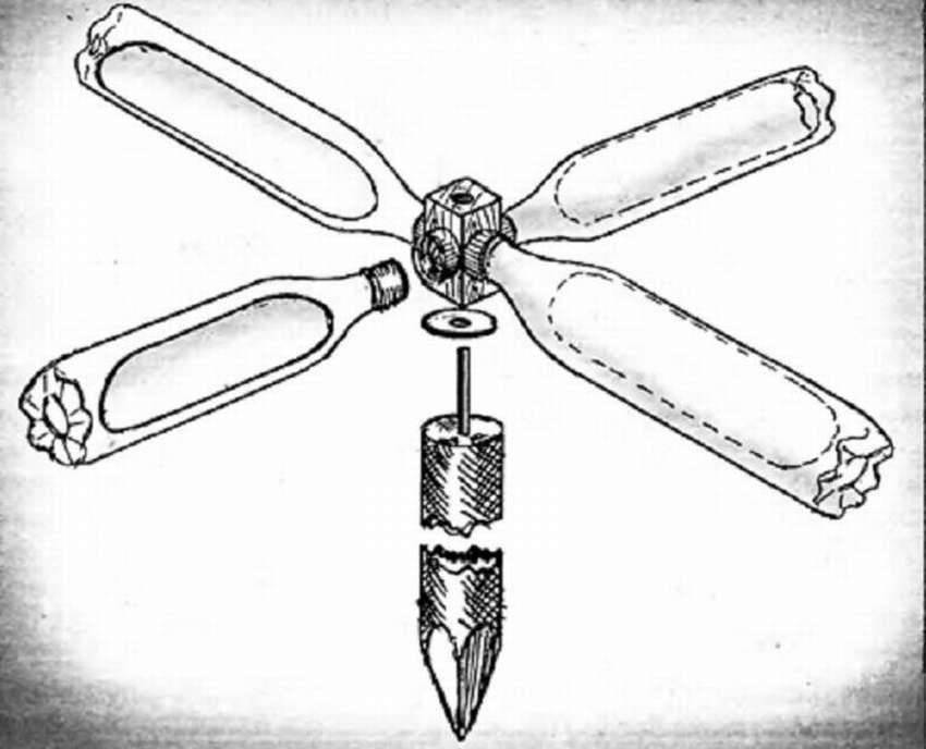 На самом деле сделать флюгер из пластиковых бутылок не так уж и сложно. На схеме показано как соединять вместе все части самодельного флюгера.