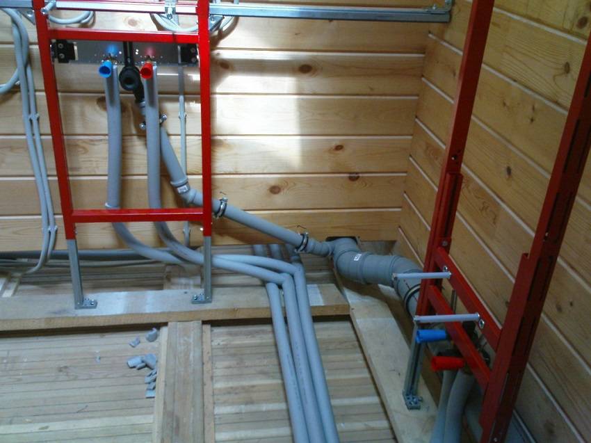 - Отводная труба через отверстие в стене проходит в ванную комнату, где могут подключаться следующие сантехнические приборы: умывальник, ванна, стиральная машина – каждое устройство со своим сифоном.
